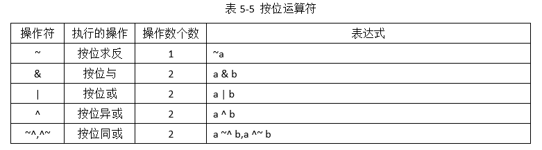 • 按位运算是两个操作数按照对应位进行“与”、“或”、“非”等逻辑操作,常用的按位运算符有5种,如表5-5所示。