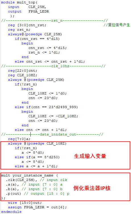 顶层文件中生成输入数据a,并调用乘法器IP核;通过LED灯显示运算结果的变化,代码如下图所示: