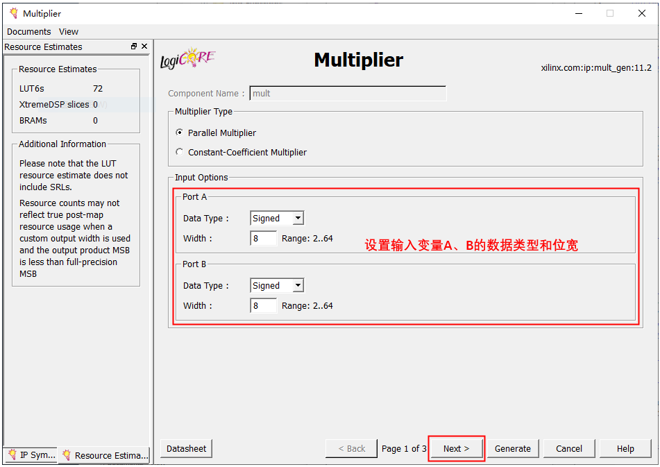 7、进入乘法器IP核设置界面,如下图所示,Multipler Type 选择parallel Multipler,。设置好输入数据的类型和位宽之后点击Next。