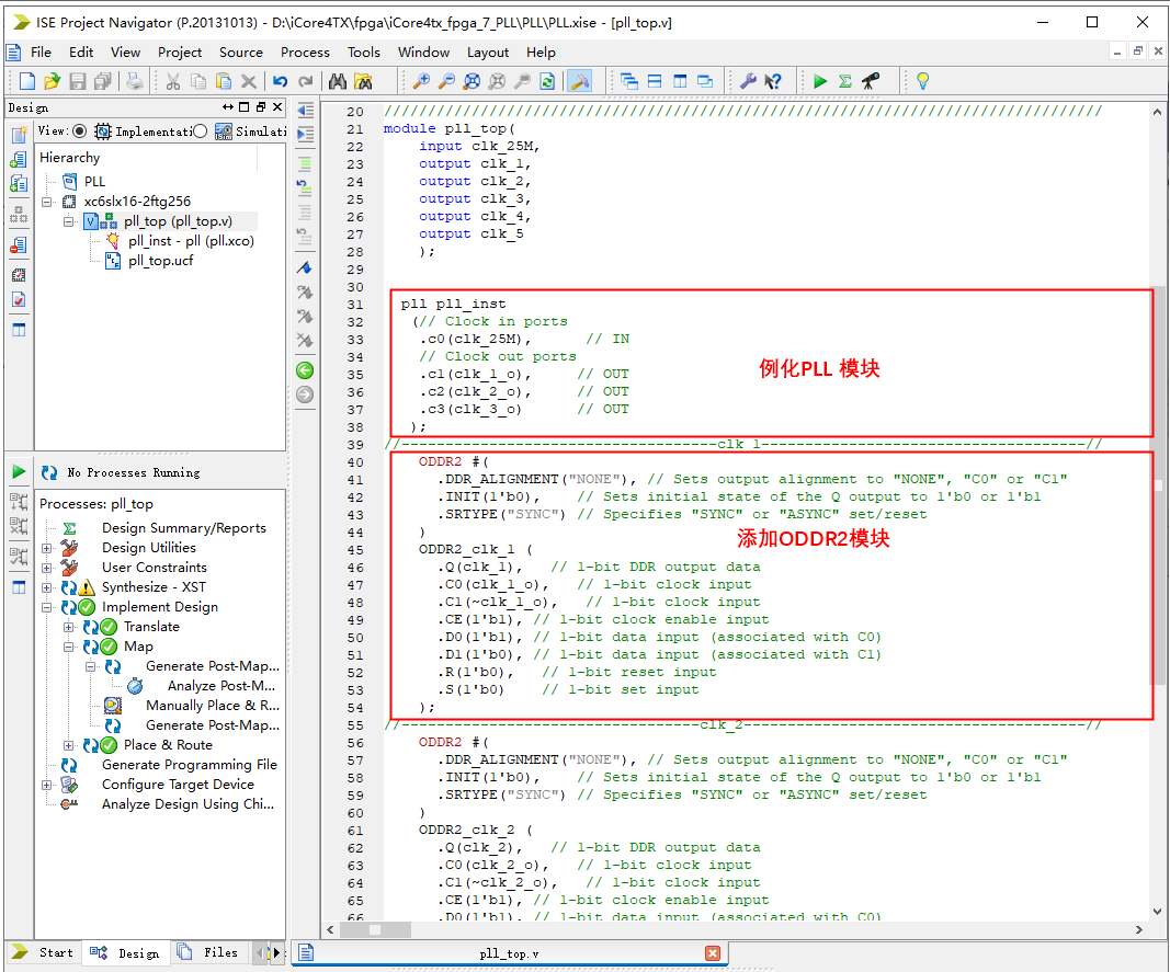 18、 将PLL IP核例化到顶层文件中,并修改信号名称;由于PLL的输出时钟信号有三个,所以这里要调用三个ODDR2模块,每个输出信号引脚都需要一个ODDR2模块缓冲。编辑后点击保存并编译,完成后如下图所示: 图7.16