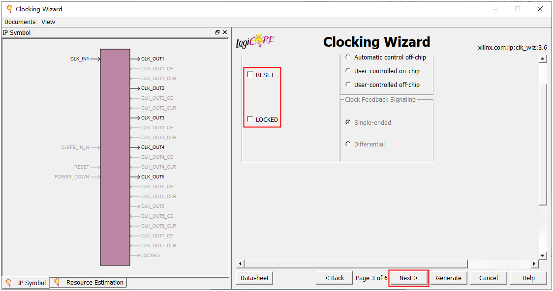 1、新建工程,命名为PLL。 图7.1 2、添加PLL核文件,在工程目录区右键单击,选则New Source…。 图7.2 3、窗口左侧栏选中“IP(CORE Generator & Arichitecture Wizard)”右侧栏给文件命名为pll,点击Next。 图7.3 4、弹出的New Source Wizard 窗口中点击“FPGA Features and Design”前面的“+”,然后点击“Clocking”前面的“+”,点击选中“Clocking Wizard”。然后点击Next。 图7.4 5、点击Finish进入PLL软核参数设置界面,Clocking Features里面勾选Frequency Synthesis(可以让PLL有多个不同的输出时钟)和Phase alignment(相位校准);Input Clock Information里输入时钟的值设置为25MHz(iCore4tx的外部晶振输入时钟是25MHz),其他保持默认,然后点击Next。 图7.5 6、 输出时钟设置界面,默认1个输出时钟,总共可以设置6个输出时钟信号,只需在时钟信号前面打勾,即可使能输出时钟信号,还可以设置每个输出时钟的频率、相位、占空比、驱动等信息。这里我们设置如下图所示,然后点击Next。 图7.6 7、 RESET表示异步复位信号,LOCKED是PLL输出时钟稳定工作的指示信号,iCore4tx没有外部复位信号,这里两个选项可以不同勾选,直接点击Next。 图7.7 8、 对输入时钟的相关设置,保持默认,直接点击Next。 图7.8 9、 本页对输入输出时钟进行命名,可以不做修改, 点击Next;本实验中将名字修改如下图中所示: 图7.9 10、 点击Genarate生成PLL IP核。 图7.10 11、 可以看到工程目录里已经添加了PLL IP核文件,点击选中PLL IP核文件,再双击CORE Generator下的View HDL Instantiationtemplate,可以在编辑区看到PLL IP核的例化模板。 图7.11 12、 新建顶层文件;在工程目录栏右键单击,选择New Source…。 图7.12 13、 弹出窗口左侧点击选中Verilog Module,右侧输入顶层模块的文件名:pll_top。 图7.13 14、 设置顶层模块名字和输入输出信号,然后点击Next,之后点击Finish。 图7.14 15、 可以在编辑区看到生成的顶层文件的内容。 图7.15 16、 给工程分配引脚,引脚绑定信息如下。