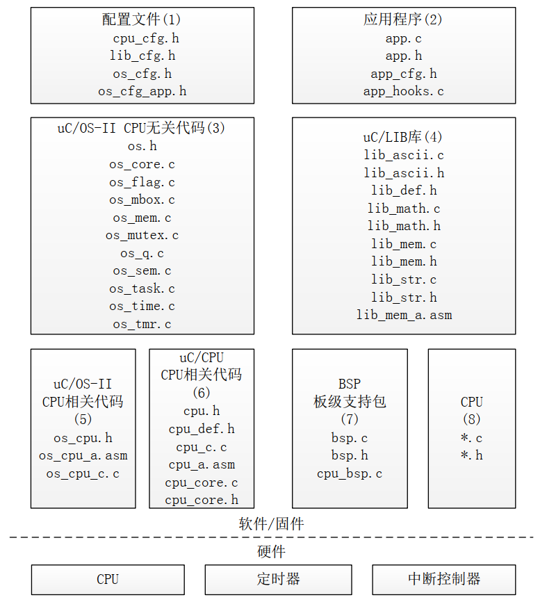• (3) 这部分是UCOSII的核心源码,它们是与处理器无关的代码,都是由高度可移植的ANSIC编写的。