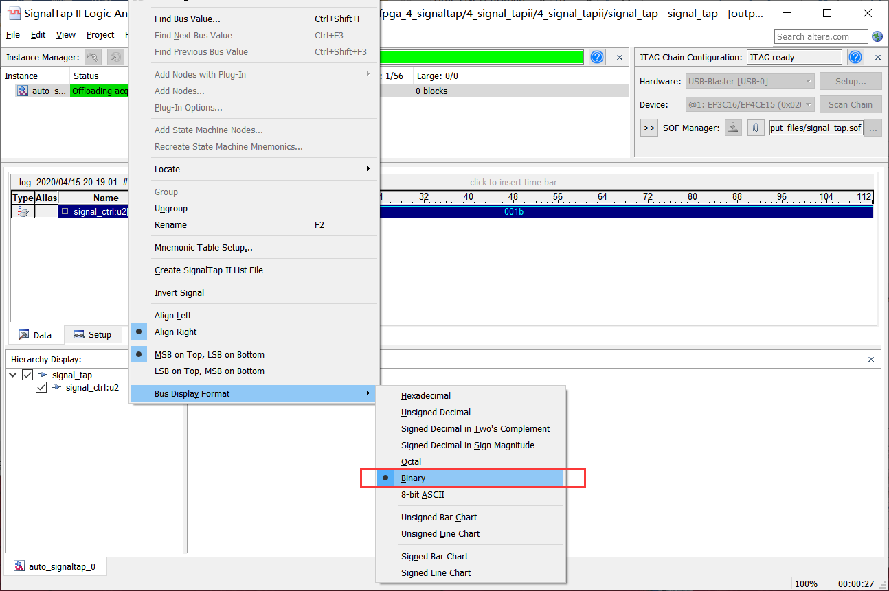 15、右键单击信号设置信号的显示方式为二进制显示,如图4-15所示。