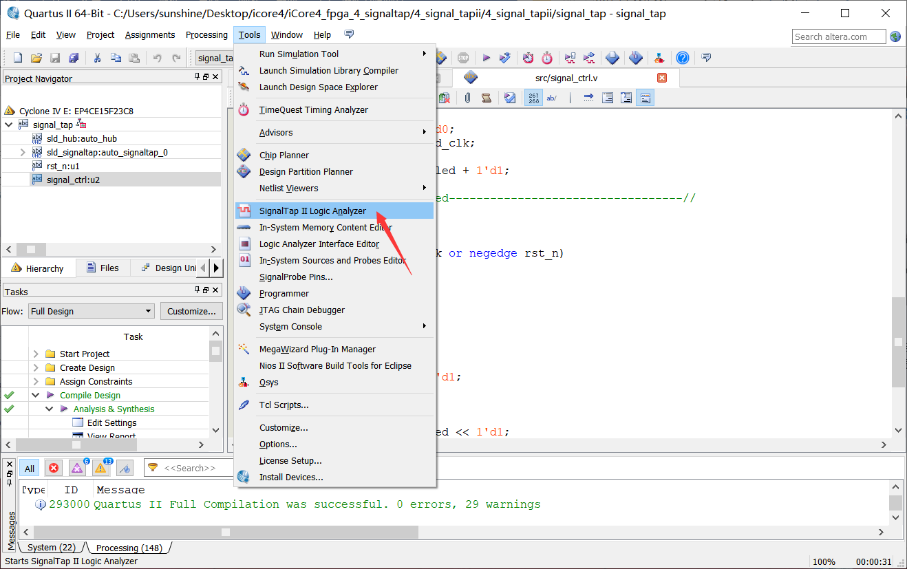 2、打开实验四例程中的QuartusII工程文件(已经完成了相关设置及引脚分配),进行重编译,然后打开Signaltap工具Tool→Signaltap II Logic Analyzer,如图4-2所示。
