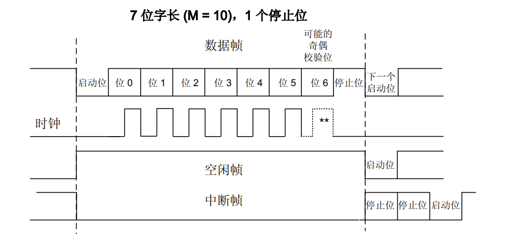 • 停止字符:可理解为在一个帧周期内接收到的电平均为“0”。发送器在中断帧的末尾插入2个停止位。