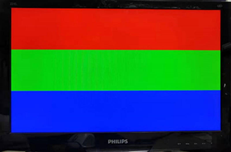 由前面的分析可以知,每一帧图像是由768行有效行像素构成的,如果我们将一帧中的有效行像素按照行数进行划分,每个划分区间分别赋予不同颜色的RGB值,则可在屏幕上实现三种色彩的条纹显示。