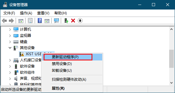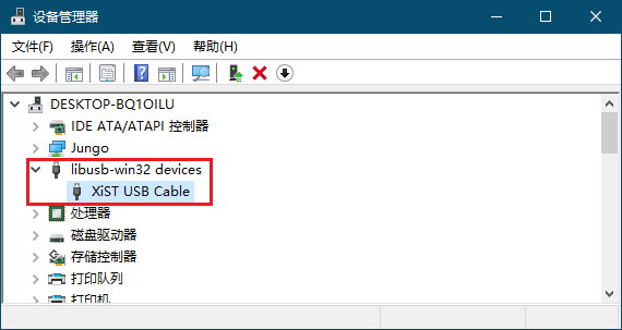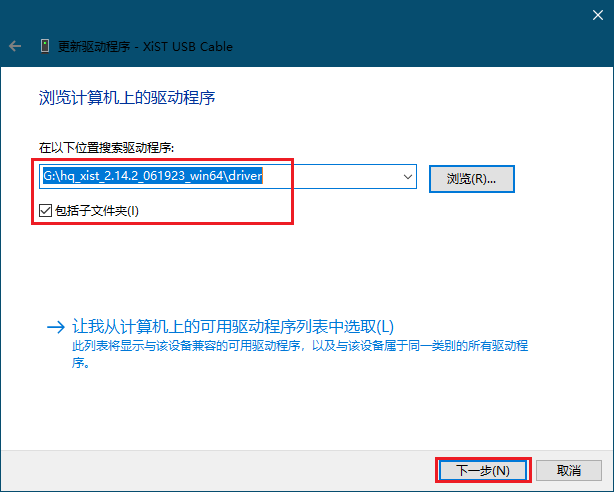 2、在windows设备管理器里找到XiST USB Cable设备,位于其他设备分类下,带黄色惊叹号 3、右键XiST USB Cable,选择更新驱动程序。 4、选择浏览我的电脑以查找驱动程序。 5、浏览文件夹,定位到HqFPGA软件存放位置下的drivers文件夹,如笔者的为:G:\hq_2.14.2_061923_win64\driver,点击下一页。 6、安装完成显示如下。 7、安装驱动成功后,在设备管理器中如下图所示。 8、安装结束,可以使用了。