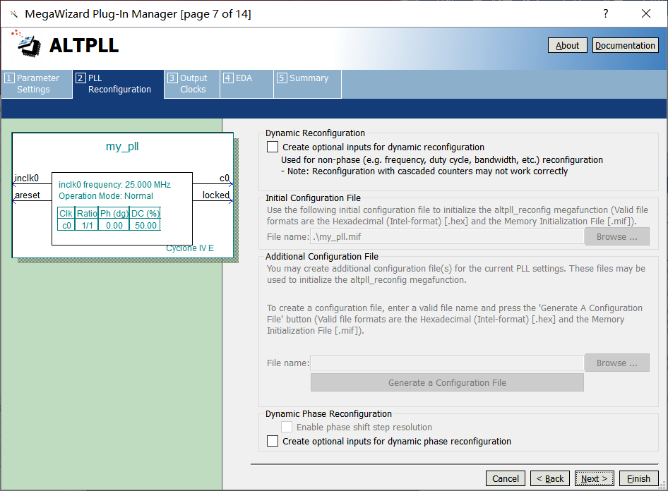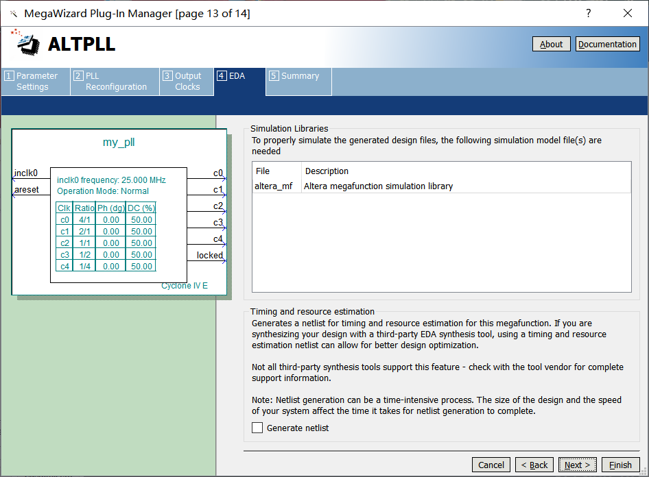 1、新建一个工程名为pll的工程,然后点击Tool →Megawizard Plug-In Manager,如图9-1所示。 图9-1 2、在该对话框选择新建IP核,如图9-2所示。 图9-2 3、在此对话框选择新建IP核类型、生成的硬件描述语言、IP核文件的存储位置,如图9-3所示。 图9-3 4、在此对话框中设置速度等级和输入时钟大小,设备芯片的速度等级是8,输入参考时钟是25MHz,如图9-4所示。 图9-4 5、添加时钟复位信号和时钟锁,两个都是非必须信号,一般不需要添加,如图9-5示。 图9-5 6、该对话框直接默认设置即可,如图9-6所示。 图9-6 7、该对话框直接默认设置即可,如图9-7所示。 图9-7 8、该对话框直接默认设置即可,如图9-8所示。 图9-8 9、设置第一个输出时钟100MHz,由25MHz输入时钟进行4倍频得到的,输出时钟相位差为0,占空比为50%,设置参数如图9-9所示。 图9-9 10、输出第二路时钟信号50MHz,设置参数如图9-10所示。 图9-10 11、输出第三路时钟信号25MHz,设置参数如图9-11示。 图9-11 12、输出第四路时钟信号12.5MHz,设置参数如图9-12所示。 图9-12 13、输出第五路时钟信号6.25MHz,设置参数如图9-13所示。 图9-13 14、在该对话框一般默认设置即可,如图9-14所示。 图9-14 15、选择要生成的IP核文件信息,一般默认即可,如图9-15所示。 图9-15 16、点击Finish后弹出该对话框,在此一定选择Yes,如图9-16所示。 图9-16 17、在工程中新建pll.v文件,并对锁相环IP核进行例化,如图9-17所示。 图9-17 18、程序编写完成后进行编译即可,此时锁相环调用完成。