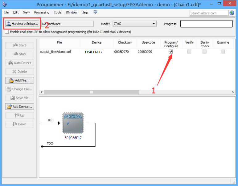 3、在programmer页面点击方框中的按钮“Add File…”来添加要烧写的文件,在弹出的窗口中找到该例程的存放路径,选中“demo.sof”点击“open”即可。