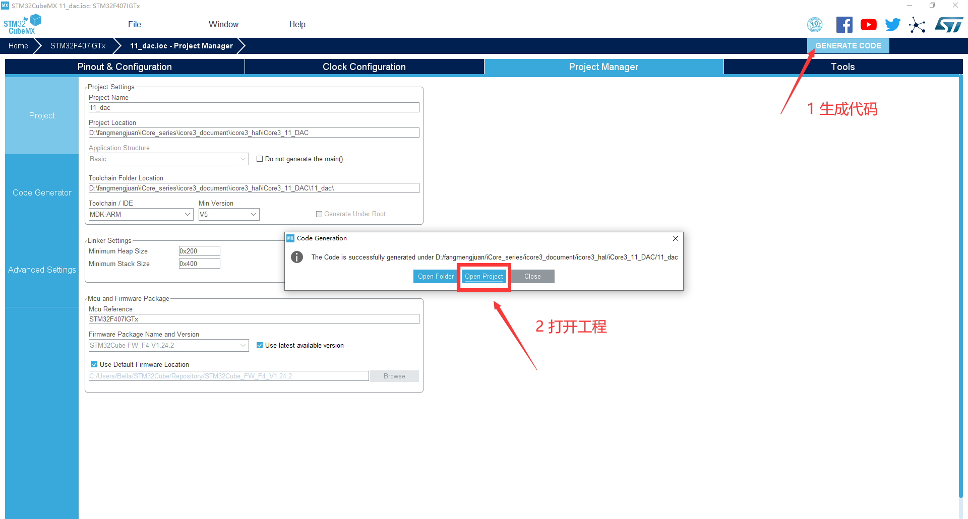 1. 新建工程:在主界面选择File–>New Project 或者直接点击ACCEE TO MCU SELECTOR  2. 出现芯片型号选择,搜索自己芯片的型号,双击型号,或者点击Start Project进入配置 在搜索栏的下面,提供的各种查找方式,可以选择芯片内核、型号等等,可以帮助你查找芯片。本实验选取的芯片型号为:STM32F407IGTx。  3. 配置RCC,使用外部时钟源  4. 配置调试引脚  5. 将LED对应的3个引脚(PI5,PI6,PI7)设置为GPIO_Output  6. 引脚模式配置  7. 配置DAC引脚  8. 时钟源设置,选择外部高速时钟源,配置为最大主频  9. 工程文件的设置, 这里就是工程的各种配置 我们只用到有限几个,其他的默认即可 IDE我们使用的是 MDK5  10. 点击Code Generator,进行进一步配置