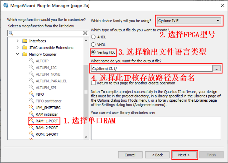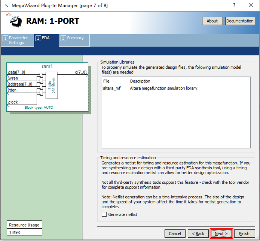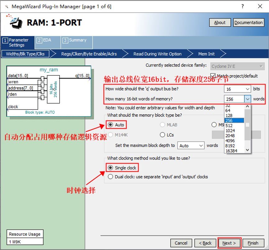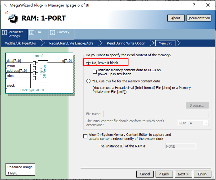 1、 打开 Tools——MegaWizard Plug-In Manager. 图1 2、 直接点击 Next. 图2 3、 在方框 1、方框 2、方框 3 处如图所示做选择,在方框 4 处选择 RAM 块的路径及命 名,然后点击 Next. 图3 4、接下来是对单口RAM进行设置,如图中所示,设置RAM的存储位宽和存储深度,本实验设置存储宽度16bit,存储深度256个字节。这里可以把RAM想象成一个表格,每行有16个格子,总共256行,这里的每个格子相当于1个bit。然后设置例化RAM在FPGA内部占用资源的类型。因为用逻辑门例化为存储器的话占用逻辑资源较多,因此FPGA内部有专门用于构建存储器用的逻辑单元,如M9K、M144K等。本次实验选择Auto,在设计中可根据实际需求进行设置。之后是时钟的选择,这里选择单时钟,即输入输出使用同一时钟。点击next进行下一项设置。 图4 5、输出信号设置和读使能信号设置。 图5 6、这里选择Old Data。 图6 7、设置RAM初始状态值。可以通过hex文件给例化的RAM存入初始数据。这里选择不存储初始数据,而是通过FPGA控制数据的写入。 图7 8、默认设置,最后点击finish。 图8 图9