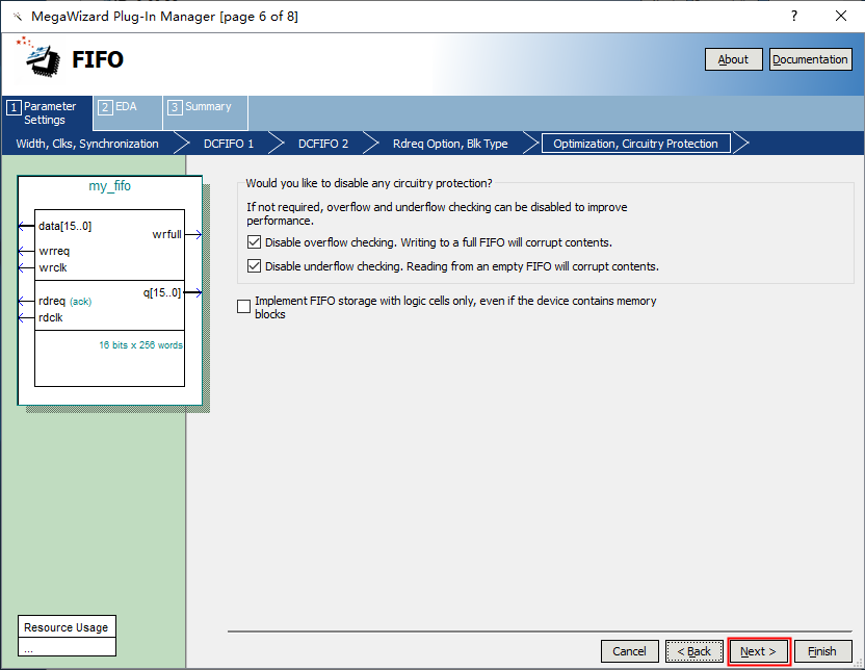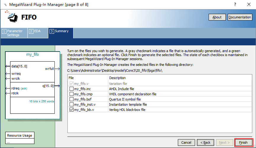 1、 打开 Tools——MegaWizard Plug-In Manager. 2、 弹出界面里默认选择第一个,创建新的宏功能模块,然后直接点击 Next。如果已经建立了IP核,想要做参数的修改,可以在这一步选择第二个选项。 3、 在Memory Complier下选择FIFO,如下图1所示。在下图中2所示位置选择FPGA类型,在3所示位置选择输出文件的命名,然后点击 Next。 4、接下来如图所示,设置FIFO的存储宽度为16bit,存储深度为256字节,类型设置为异步模式,即读写操作不使用同一个时钟信号。可以在左侧状态显示里看到当前设置的FIFO的控制信号和存储信息,核对无误后点击 Next 。 5、对FIFO进行优化类型的选择,该页面保持默认设置,直接点击 Next。 6、设置控制信号,这里勾选了写满标志位信号。FIFO 就建好了。 7、读取模式设置为预读取模式,即先读取一个数据,当rdreq有效时开始读取第二个数据。存储类型选择Auto,点击Next。 8、优化设置和仿真相关设置,参考下图设置,点击Next。 9、点击Finish,完成FIFO的构建。