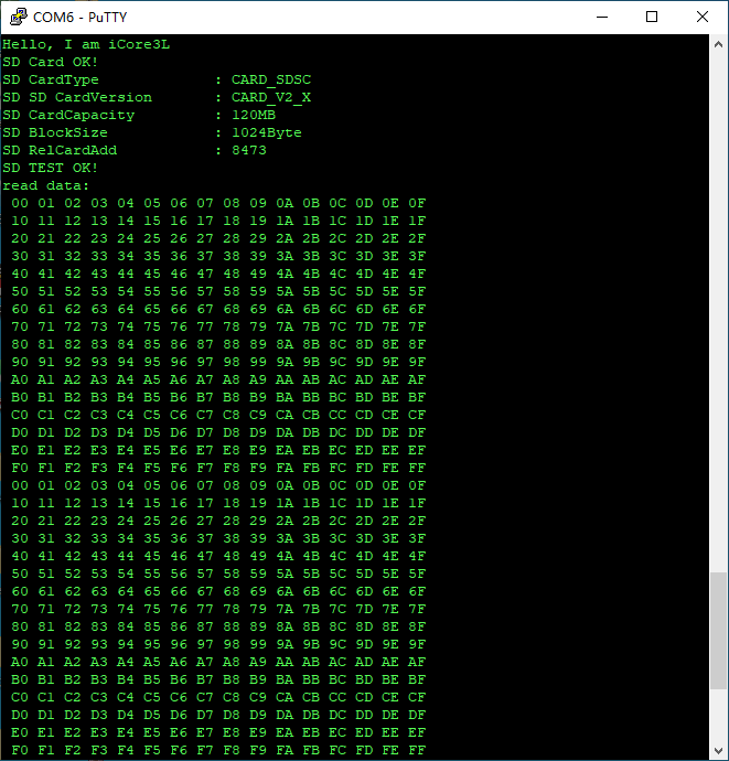 终端显示出SD卡的相关信息,并输出写入SD卡的数据。