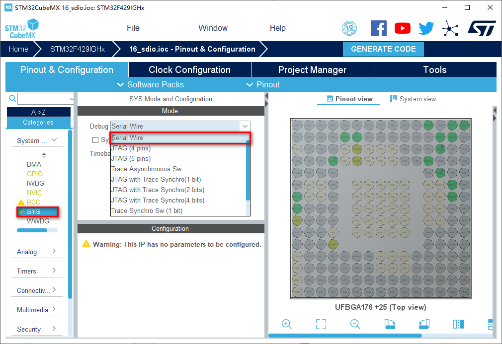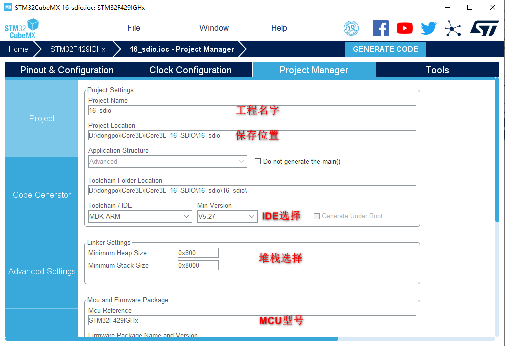 1.在主界面选择File–>New Project或者直接点击ACCEE TO MCU SELECTOR 2.出现芯片型号选择,搜索自己芯片的型号,双击型号,或者点击Start Project进入配置在搜索栏的下面,提供的各种查找方式,可以选择芯片内核,型号,等等,可以帮助你查找芯片。本实验选取的芯片型号为:STM32FIGHx。 3.配置RCC,使用外部时钟源 4.Debug选择Serial Wire,时基源选择SysTick 5.将PI3,PI4,PH14设置为GPIO_Output 6.引脚模式配置 7.设置串口 8.在NVIC Settings一栏使能接收中断 9.配置SDIO 10.时钟源设置,选择外部高速时钟源,配置为最大主频 11.工程文件的设置, 这里就是工程的各种配置 我们只用到有限几个,其他的默认即可IDE我们使用的是MDK V5.27 12.点击Code Generator,进行进一步配置