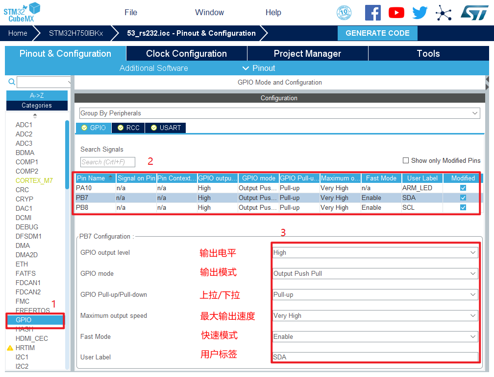 5.将PA10,PB7,PB8设置为GPIO_Output