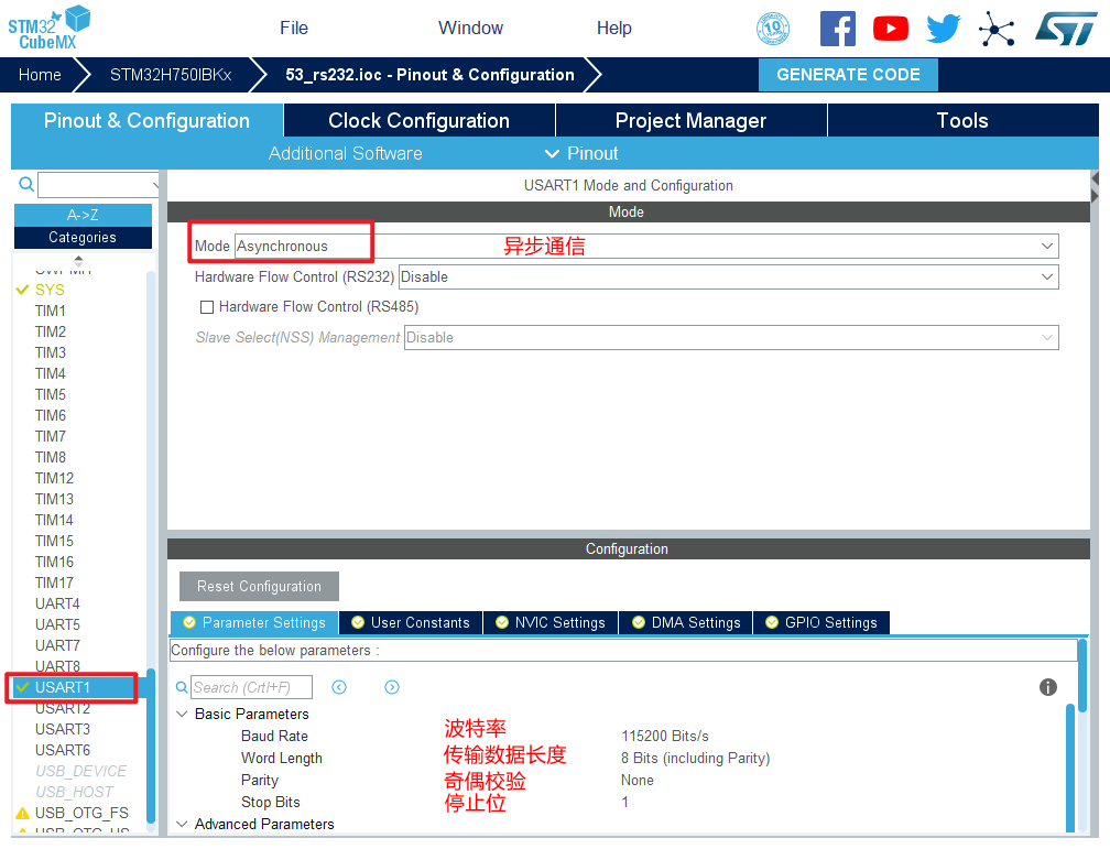 在NVIC Settings一栏使能接收中断