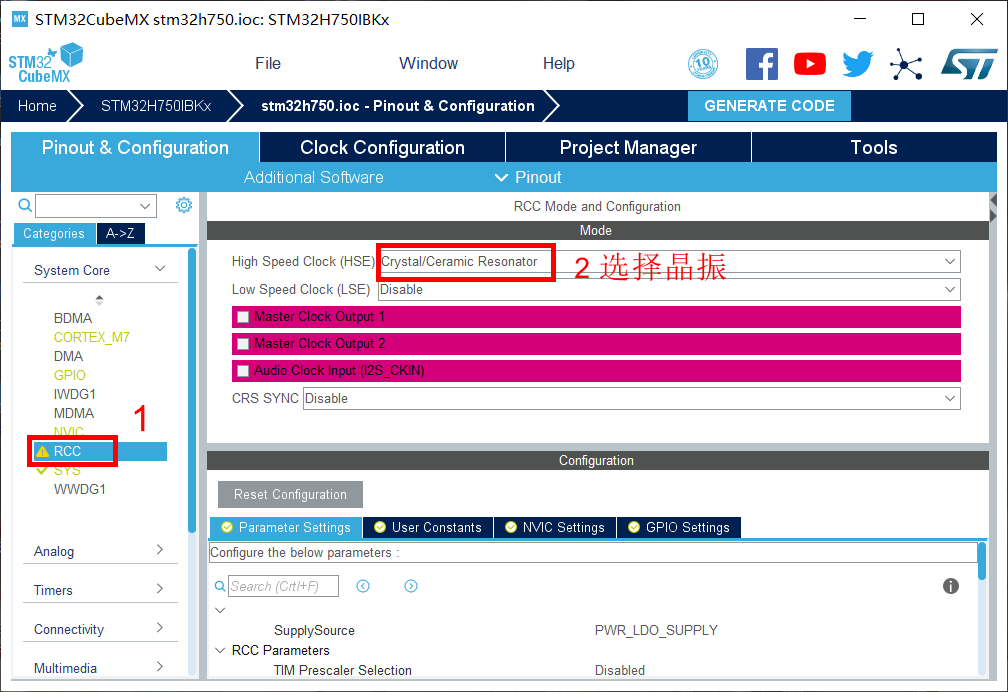 1.在主界面选择File–>New Project 或者直接点击ACCEE TO MCU SELECTOR 2.出现芯片型号选择,搜索自己芯片的型号,双击型号,或者点击Start Project进入配置 在搜索栏的下面,提供的各种查找方式,可以选择芯片内核、型号等等,可以帮助你查找芯片。本实验选取的芯片型号为:STM32H750IBKx。 3.配置RCC,使用外部时钟源 4.时基源选择SysTick 5.将PA10,PB7,PB8,PI1,PI2,PI3设置为GPIO_Output 6.引脚模式配置 7.配置定时器 定时器分配引脚如下所示 8.配置FMC 9.配置SDMMC 10.配置LTDC 11.配置CRC 12.配置FATFS 13.时钟源设置,选择外部高速时钟源,配置为最大主频。 14.工程文件的设置, 这里就是工程的各种配置 我们只用到有限几个,其他的默认即可 IDE我们使用的是 MDK V5.27 15.点击Code Generator,进行进一步配置