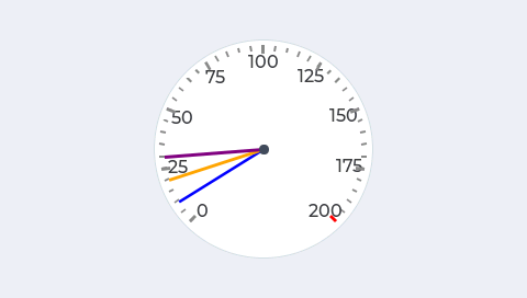 例如,我想在仪表盘上显示9个比例标签,将刻度值分为8份,刻度值范围设为 [0, 200],则每两个标签之间范围是25,将25细分为5,需要细分刻度 subdivision 为4,则刻度行 line_num 总共需要 ( 4 + 1)*( 9 - 1) + 1 = 41个。