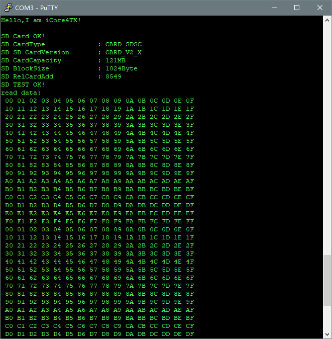 终端显示出SD卡的相关信息,并输出写入SD卡的数据。