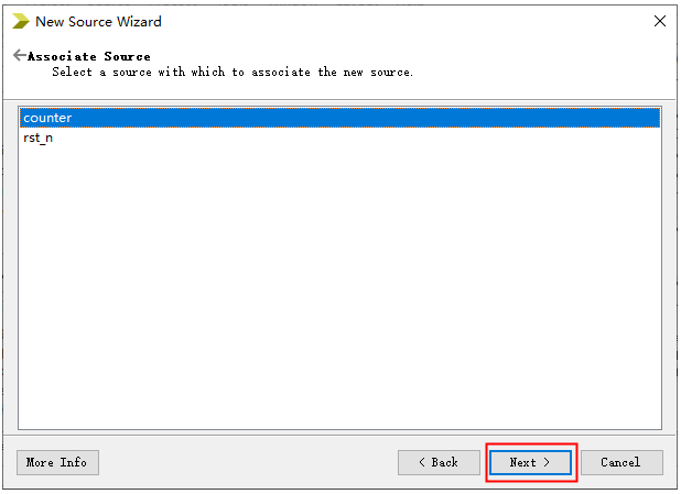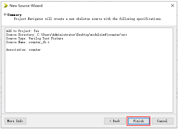 3. 选择新建文件类型为Verilog Test Fixture,File name命名为counter_tb,然后点击Next。注意测试文件的存放路径,本实验将其和FPGA工程的源文件放到一起。