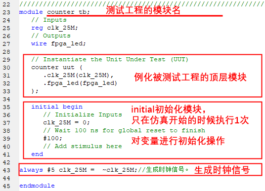 7.向测试文件中添加代码:always #5 clk_25M = ~clk_25M;生成时钟信号。产生模拟的时钟信号,测试文件主要包含内容如下图所示。可以看到,测试工程是将FPGA工程的顶层模块作为Modelsim工程的一个子模块,例化到测试工程中,并给予时钟等外部激励信号,并通过initial语句对激励信号赋初值。