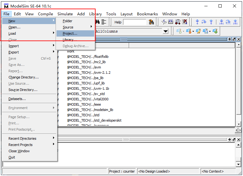 8.双击打开Modelsim软件,点击File New Project…,新建modelsim工程。