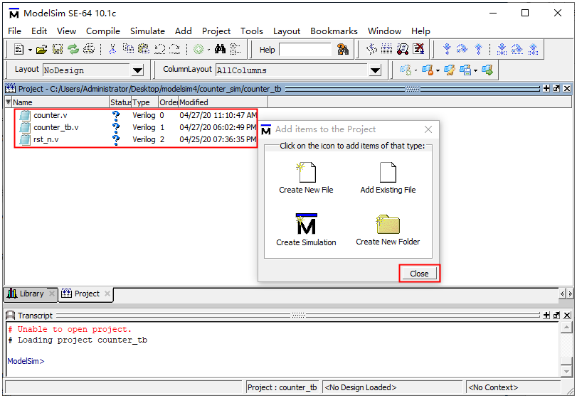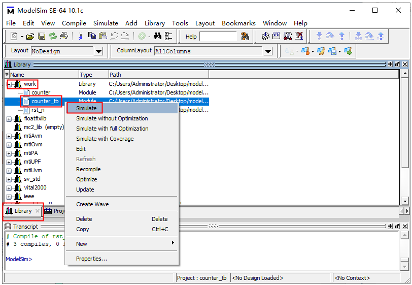 15.在Library中work目录下,选中测试文件counter_tb.v,双击或者右键点击Simulate。