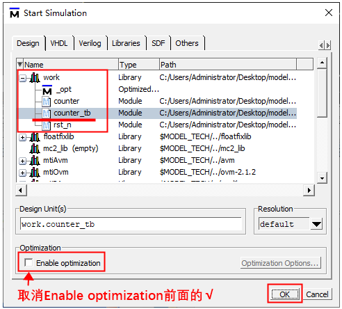 17.点击work前面的“+”,选中测试文件counter_tb,取消Enable optimization前面的“√”,然后点击OK。