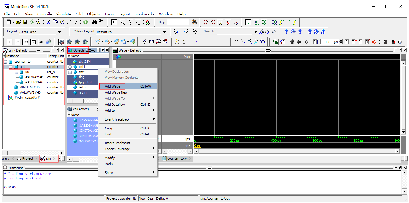 18. Sim页面选中counter_tb下的uut模块,可以看到Objects窗口出现counter模块的信号列表,选中该列表中需要观察的信号,右键点击Add Wave