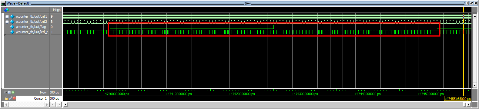 21. 可以直观的看到,led的控制信号的周期性变化,如下图所示(为了直观展示信号的周期变化,将counter文件中cnt1和cnt2的值累加到50后进行清零)。