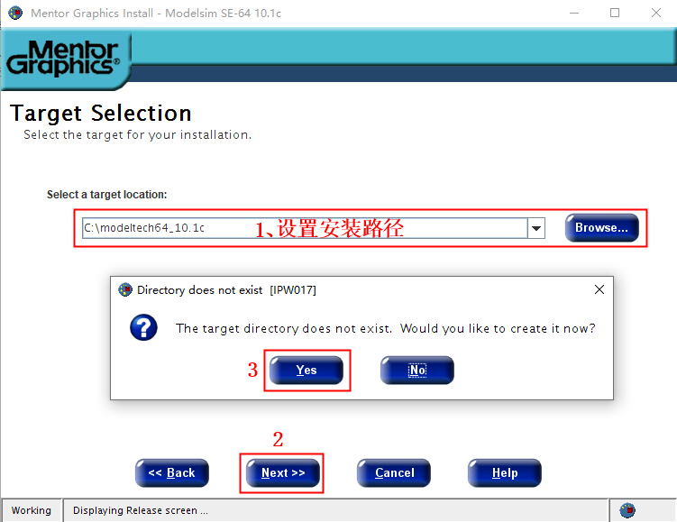 3. 红框1处选择安装路径,然后点击 Next。弹出窗口询问是否建立文件夹,选择Yes.