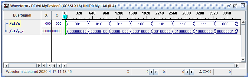 3. 通过ChipScopePro查看输入信号与输出信号之间的关系,观察实验现象——如图16-3所示。