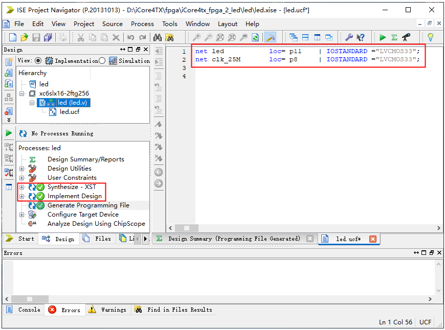1、双击Xilinx FPGA 开发软件图标打开软件,出现下面界面,如图2.2所示,点击红框中New Project…。 图2.2 2、点击新建图标出现下面对话框,给新工程命名led,并选择好工程存放路径;顶层文件是Verilog HDL 语言编写的,因此这里将顶层文件的格式选为HDL,具体如下图所示。 图2.3 3、弹出窗口中选择对应的FPGA器件,iCore4TX双核心板的FPGA型号为Xilinx的XC6SLX16-2FTG256。则在下面界面选择FPGA器件时按照图中所示设置即可。然后点击Next。 图2.4 4、直接点击Next,弹出新建工程信息汇总,如下图,直接点击Finish。 图2.5 5、进入工程编辑界面,可以看到左边的工程文件目录区、右边的代码编辑区以及下边栏的工程信息打印区,如图2.6所示。 图2.6 6、在工程文件目录区可以看到刚刚建立的新工程led,选中led工程,右键弹出下拉栏中点击New Source,新建Verilog文件。 图2.7 7、弹出窗口中,在左侧栏中选中Verilog Module,并将Verilog 文件命名为led;文件命名栏下面是新建文件的保存路径。这里选择保存路径时可以在工程文件夹下新建一个src文件夹,专门用于存储Verilog Source 文件。各项都设置好以后,点击Next。 图2.8 8、弹出窗口中设置led模块的端口信号,这里点击Next。 图2.9 9、弹出窗口是新建的源文件led.v的信息提示,点击Finish。 图2.10 10、在主界面可以看到左边工程目录区多了led模块文件,右边代码编辑区是软件自动生成的模块信息。如下图所示。 图2.11 11、向led 模块module led中添加工程代码,通常一个完整的模块由module和endmodule为开始和结尾,除此外还包括模块名、端口变量及类型的定义、硬件语言描述、内部变量定义等信息,如此组成一个完整的功能模块,如图2.12所示。 图2.12 12、程序编写完成后进行编译,检查语法错误;首先在工程目录文件区选中顶层模块led,然后在工程目录区下边的Design栏,找到Synthesize – XST,右键点击Run,如图2.13所示。 图2.13 13、编译通过会在Synthesize – XST前面出现一个对号,表示没有语法错误。同时在工程编辑区会显示编译信息,如寄存器和逻辑门等的资源消耗情况。