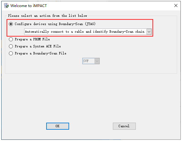 1、首先将下载器连接到iCore4TX核心板的JTAG接口,和MicroUSB 线连接到连接到iCore4TX 的核心板上,并给板子供电。 图2.17 2、本例程采用iMPACT的下载方式。点击Configure Target Device 前面的“+”,然后选中“Manage Configuration Project(iMPACT)”,双击运行或者右键单击Run。如图所示。 图2.18 3、然后在弹出窗口中点击左上角的Launch Wizard。 图2.19 4、出现如下界面,直接点击OK,默认选择JTAG。 图2.20 5、弹出提示中点击Yes,添加“.bit”文件。 图2.21 6、在弹出的文件路径窗口中,找到前面生成的“.bit”文件,选中后点击Open。 图2.22 7、此窗口中点击OK。 图2.23 8、弹出的对话框中选择No。 图2.24 9、返回到ISE的iMPACT界面;选中芯片图标,单击右键选择Program; 图2.25 10、弹出的提示窗口中单击OK,如果一切正常下载成功,iMPACT界面会出现蓝色的Program Succeeded提示字样。表明程序已经下载至FPGA。此时可以观察到FPGA_LED闪烁。