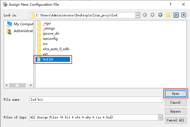 添加“.bit”文件时,还可以在iMPACT界面,点击芯片图标,右键选择Assign New Configuration File…。后面的操作步骤不变。 图2.26