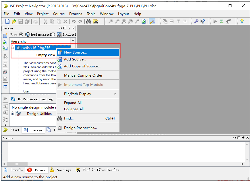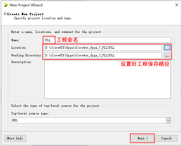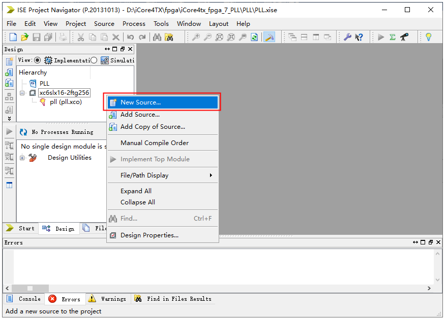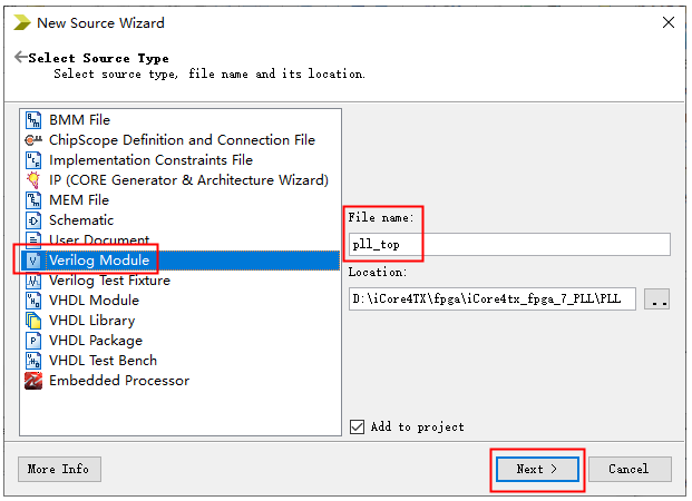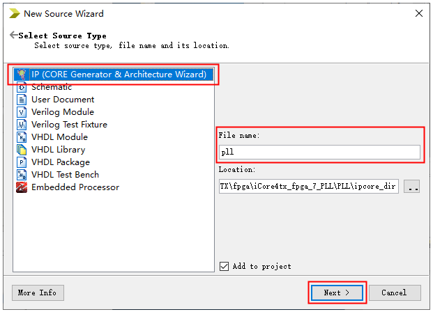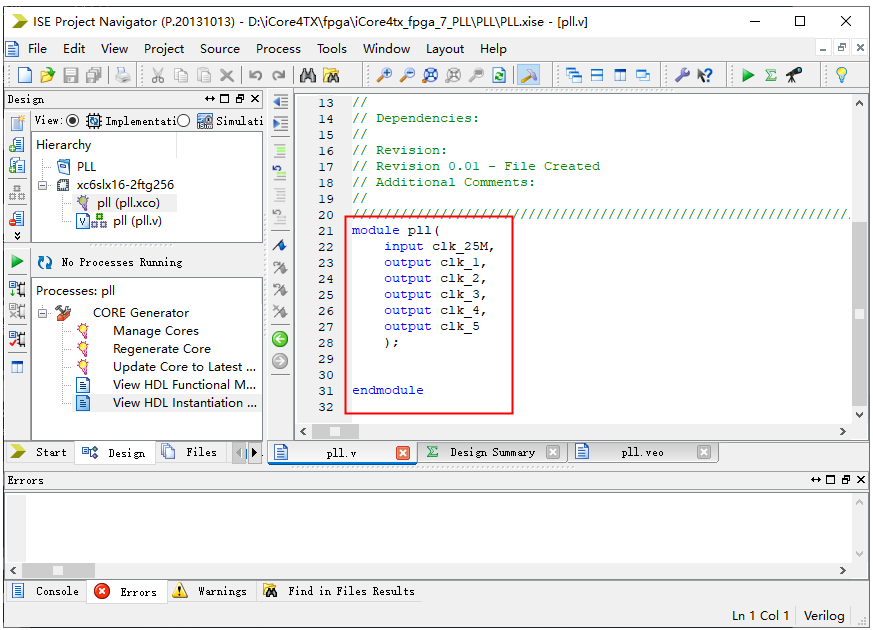1、新建工程,命名为PLL。 图7.1 2、添加PLL核文件,在工程目录区右键单击,选则New Source…。 图7.2 3、窗口左侧栏选中“IP(CORE Generator & Arichitecture Wizard)”右侧栏给文件命名为pll,点击Next。 图7.3 4、弹出的New Source Wizard 窗口中点击“FPGA Features and Design”前面的“+”,然后点击“Clocking”前面的“+”,点击选中“Clocking Wizard”。然后点击Next。 图7.4 5、点击Finish进入PLL软核参数设置界面,Clocking Features里面勾选Frequency Synthesis(可以让PLL有多个不同的输出时钟)和Phase alignment(相位校准);Input Clock Information里输入时钟的值设置为25MHz(iCore4tx的外部晶振输入时钟是25MHz),其他保持默认,然后点击Next。 图7.5 6、 输出时钟设置界面,默认1个输出时钟,总共可以设置6个输出时钟信号,只需在时钟信号前面打勾,即可使能输出时钟信号,还可以设置每个输出时钟的频率、相位、占空比、驱动等信息。这里我们设置如下图所示,然后点击Next。 图7.6 7、 RESET表示异步复位信号,LOCKED是PLL输出时钟稳定工作的指示信号,iCore4tx没有外部复位信号,这里两个选项可以不同勾选,直接点击Next。 图7.7 8、 对输入时钟的相关设置,保持默认,直接点击Next。 图7.8 9、 本页对输入输出时钟进行命名,可以不做修改, 点击Next;本实验中将名字修改如下图中所示: 图7.9 10、 点击Genarate生成PLL IP核。 图7.10 11、 可以看到工程目录里已经添加了PLL IP核文件,点击选中PLL IP核文件,再双击CORE Generator下的View HDL Instantiationtemplate,可以在编辑区看到PLL IP核的例化模板。 图7.11 12、 新建顶层文件;在工程目录栏右键单击,选择New Source…。 图7.12 13、 弹出窗口左侧点击选中Verilog Module,右侧输入顶层模块的文件名:pll_top。 图7.13 14、 设置顶层模块名字和输入输出信号,然后点击Next,之后点击Finish。 图7.14 15、 可以在编辑区看到生成的顶层文件的内容。 图7.15 16、 给工程分配引脚,引脚绑定信息如下。