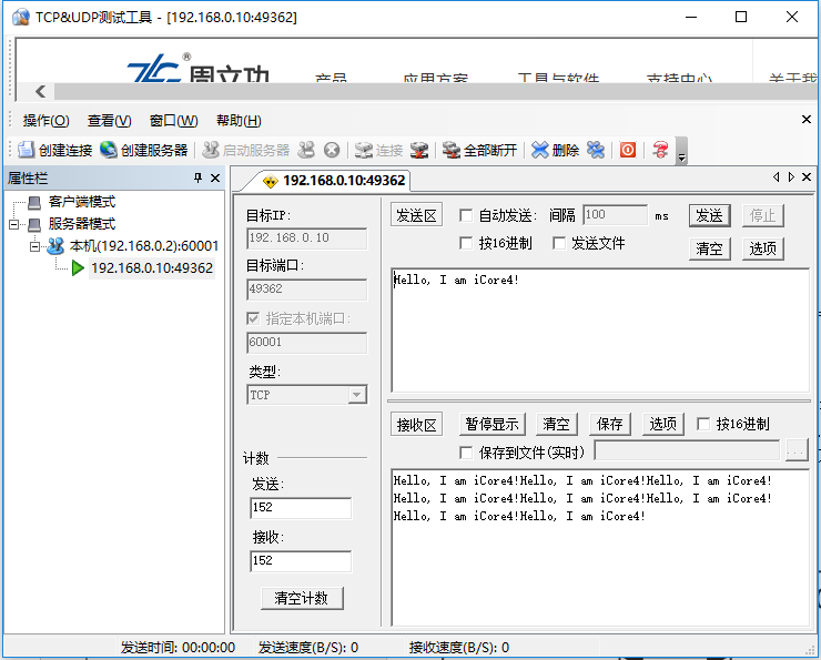 (1)打开测试工具,界面如下。点击创建服务器,弹出了设置端口的窗口,端口设置为60001。 (2)服务器已经创建完成(如下图),点击启动服务器 (3)iCore4客户端自动连接服务器,即可进行通信。(若连接不上请关闭电脑防火墙)