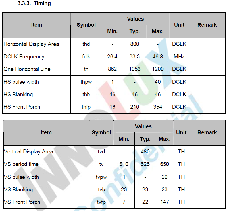 从上图可以看出,TFT_LCD液晶推荐的驱动时钟频率为33.3MHz,我们用的是30MHz。以DCLK单个时钟周期为单位,行扫描需要1056个时钟周期,列扫描则需要525个。可以发现,本次实验采用的7寸TFT_LCD屏幕驱动和VGA驱动的时序控制方式几乎一样,那么VGA驱动部分的代码我们就可以拿来复用了。同样的,TFT_LCD屏在顺序扫描时,通过控制行列像素RGB值的不同,可以实现红绿蓝三色条纹的显示。