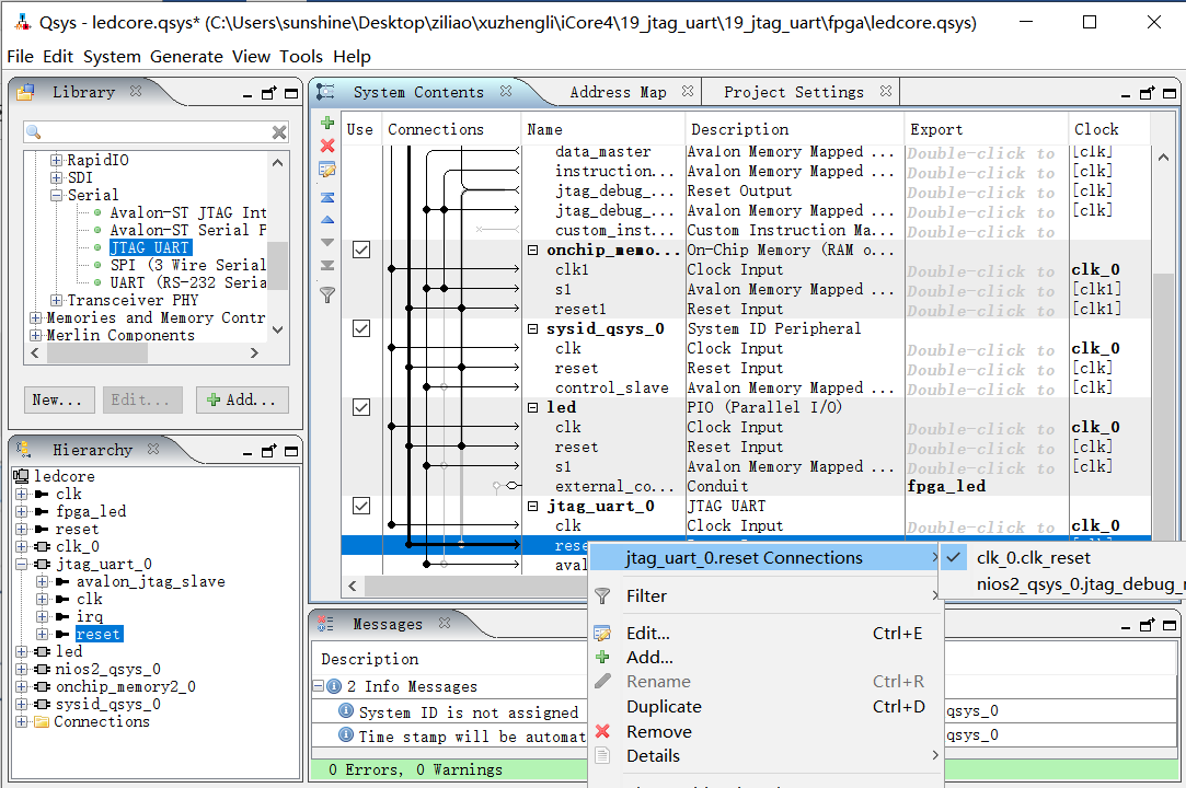 8、下面开始连接时钟线,右击jtag_uart_0下面的clk与clk_0连线: