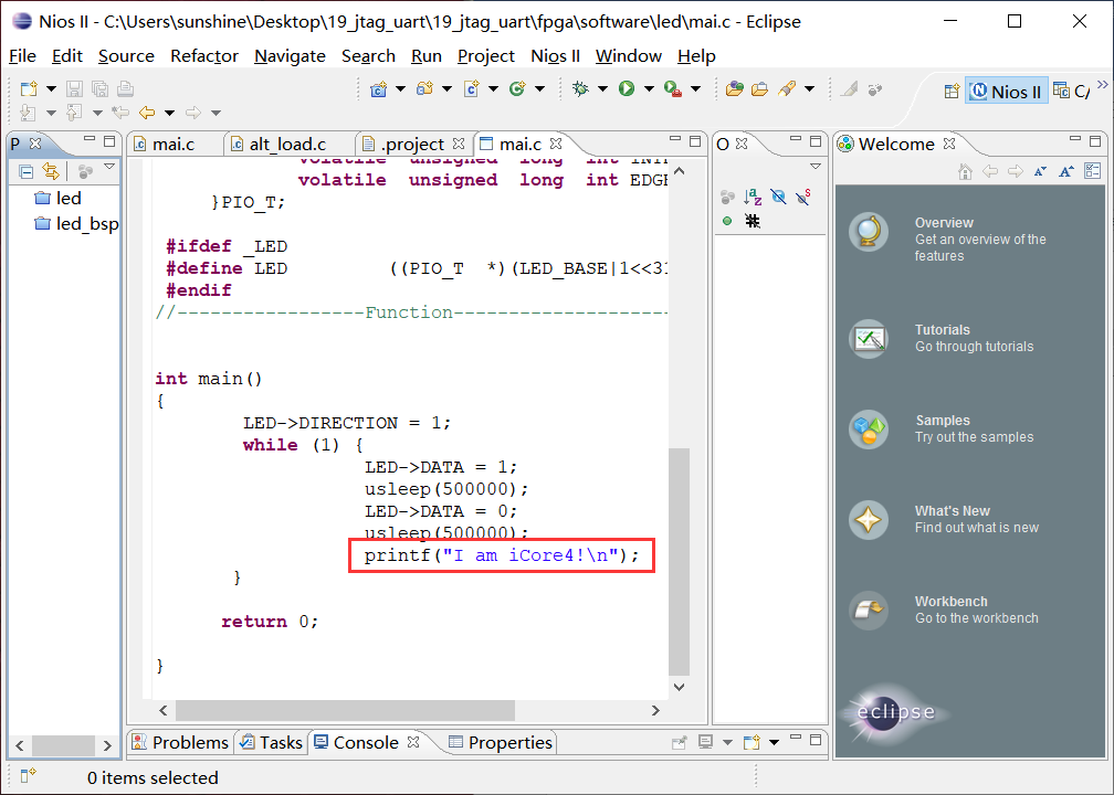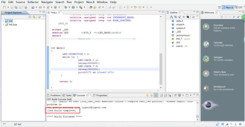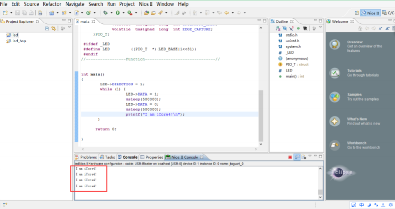 10、点击Run,运行成功后iCore4开发板上有led灯闪的现象,并在下面的有终端显示信息,如下图所示: