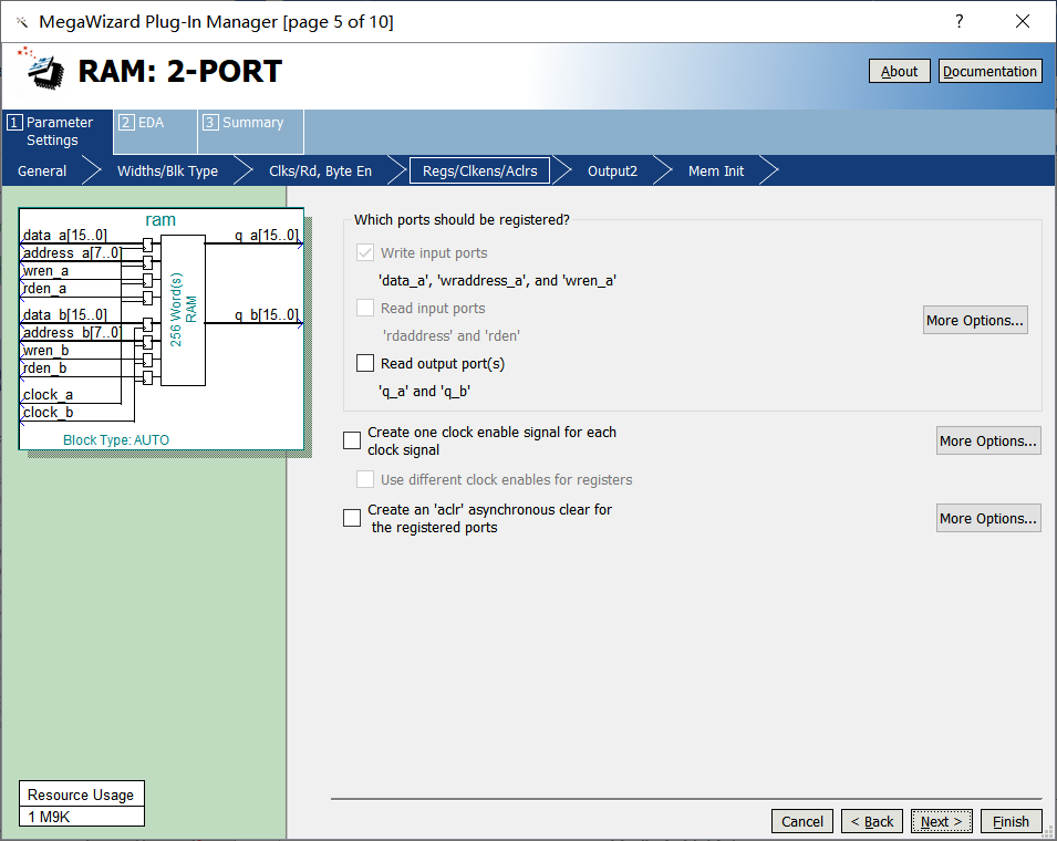 4、在该对话框中选择真双口RAM(两个输入两个输出),存储深度以字节为单位,如图16-6示。