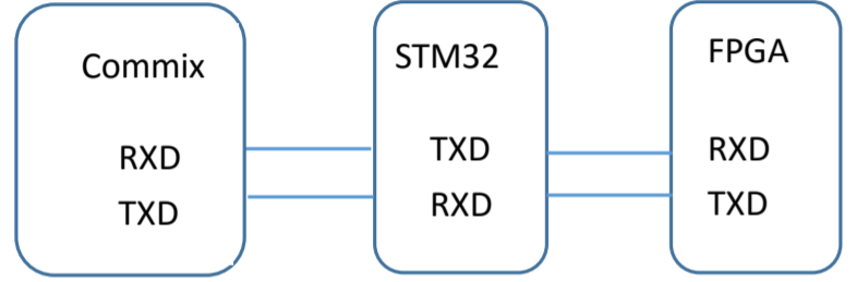 本实验通过FPGA建立的USART模块对外提供RXD、TXD接口,与STM32的TXD、RXD串口I/O相连接,Commix串口精灵与STM32连接,实现三者之间的通信。本实验中,Commix串口精灵向STM32发送数据,STM32的RXD端口接收数据,然后,通过TXD端口把数据发送至FPGA,STM32起到一个桥梁作用。程序运行后,FPGA定时向STM32发送数据,经过STM32发送至串口精灵显示出来。下图为实验原理图。