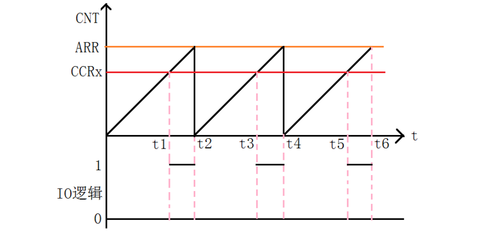 脉宽调制模式可以生产一个由TIMx_ARR寄存器确定频率,由TIMx_CCRx确定占空比的信号。如下图所示: