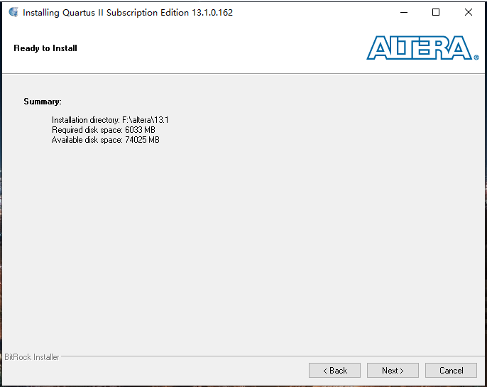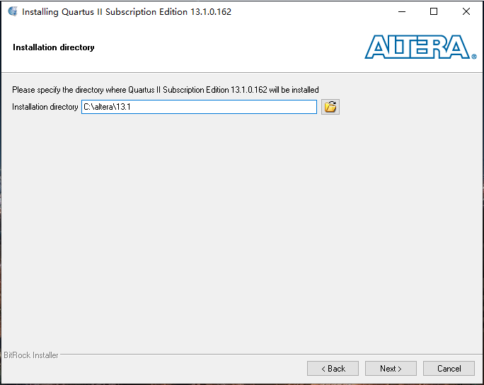 1、双击Quartussetup-13.1.0.162应用程序进行安装,出现如下对话框,如图0-1所示。 图0-1 2、点击Next出现下面对话框,如图0-2所示. 图0-2 3、选择接受协议,然后点击Next,出现下面对话框,在该对话框中选择安装路径,本教程选择安装到F盘,如图0-3所示。 图0-3 4、选择要安装的器件库等信息,一般全选,如图0-4所示。 图0-4 5、点击Next后进入下面对话框,显示软件的一些安装信息,如图0-5所示。 图0-5 6、点击Next开始进行安装,时间可能会稍长,请耐心等待,如图0-6所示。 图0-6 7、安装结束后自动进入下面对话框,直接点击Finish即可,安装结束,如图0-7所示。 图0-7