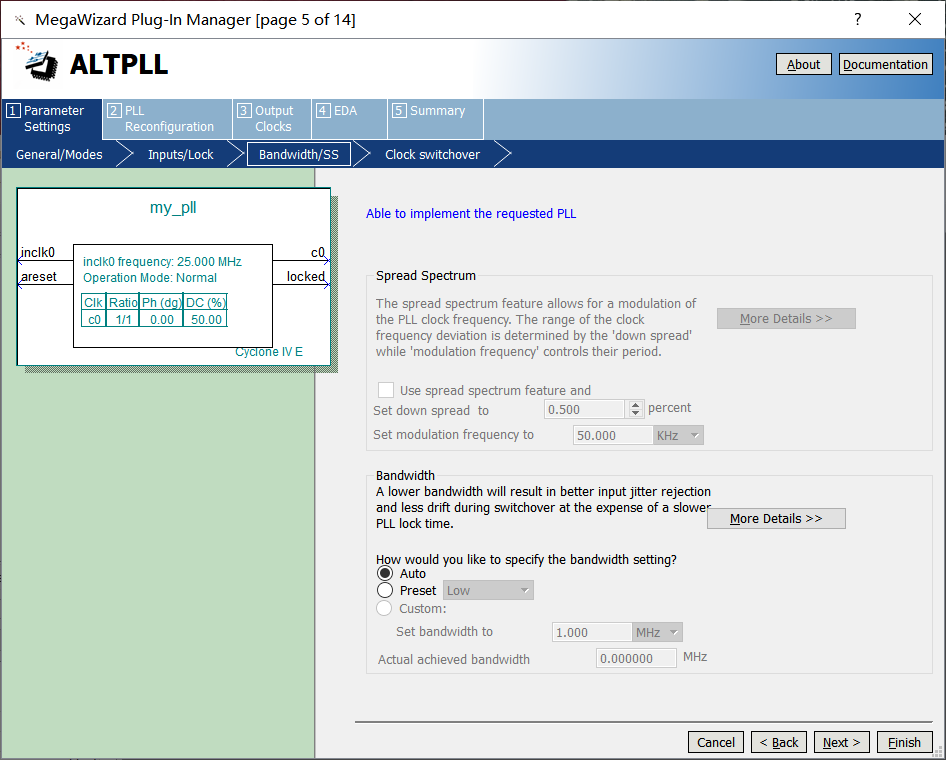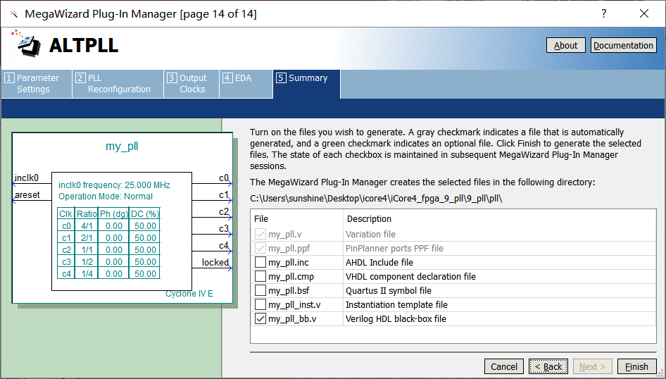 1、新建一个工程名为pll的工程,然后点击Tool →Megawizard Plug-In Manager,如图9-1所示。 图9-1 2、在该对话框选择新建IP核,如图9-2所示。 图9-2 3、在此对话框选择新建IP核类型、生成的硬件描述语言、IP核文件的存储位置,如图9-3所示。 图9-3 4、在此对话框中设置速度等级和输入时钟大小,设备芯片的速度等级是8,输入参考时钟是25MHz,如图9-4所示。 图9-4 5、添加时钟复位信号和时钟锁,两个都是非必须信号,一般不需要添加,如图9-5示。 图9-5 6、该对话框直接默认设置即可,如图9-6所示。 图9-6 7、该对话框直接默认设置即可,如图9-7所示。 图9-7 8、该对话框直接默认设置即可,如图9-8所示。 图9-8 9、设置第一个输出时钟100MHz,由25MHz输入时钟进行4倍频得到的,输出时钟相位差为0,占空比为50%,设置参数如图9-9所示。 图9-9 10、输出第二路时钟信号50MHz,设置参数如图9-10所示。 图9-10 11、输出第三路时钟信号25MHz,设置参数如图9-11示。 图9-11 12、输出第四路时钟信号12.5MHz,设置参数如图9-12所示。 图9-12 13、输出第五路时钟信号6.25MHz,设置参数如图9-13所示。 图9-13 14、在该对话框一般默认设置即可,如图9-14所示。 图9-14 15、选择要生成的IP核文件信息,一般默认即可,如图9-15所示。 图9-15 16、点击Finish后弹出该对话框,在此一定选择Yes,如图9-16所示。 图9-16 17、在工程中新建pll.v文件,并对锁相环IP核进行例化,如图9-17所示。 图9-17 18、程序编写完成后进行编译即可,此时锁相环调用完成。