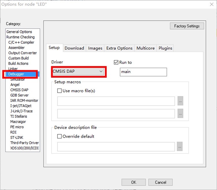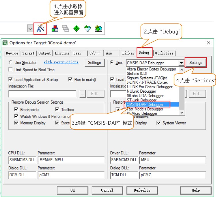 1、点击Keil软件的小彩棒进入配置界面,点击Debug,选择“CMSIS-DAP”模式后,点击Setting进入设置页面。