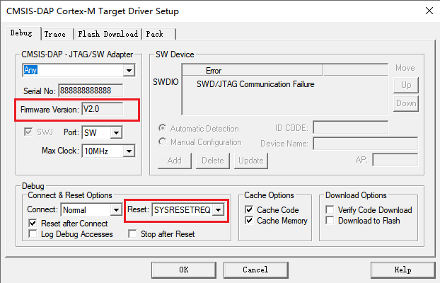 1、点击Keil软件的小彩棒进入配置界面,点击Debug,选择“CMSIS-DAP”模式后,点击Setting进入设置页面。 2、进入Debug页面,能够看到识别到的仿真器,将端口配置为SW模式后,并对仿真器的速度和复位进行设置。 当仿真器固件版本不同时,可以在Firmware Version处查看固件版本,版本2.0时,复位设置如图所示。 3、在Flash Download页面可以对扇区擦除、程序下载后自动运行和编程算法进行设置。