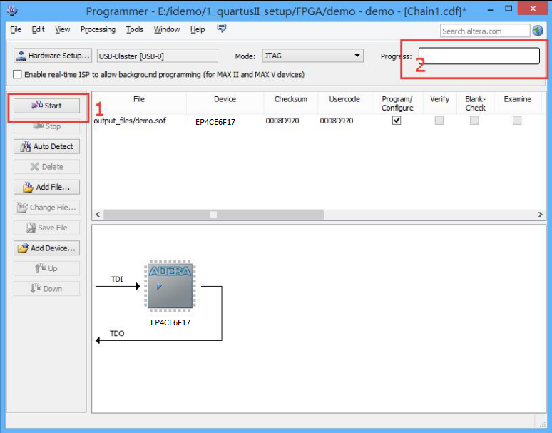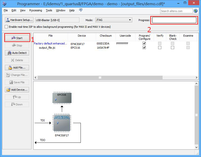 7、最后点击1处的start开始烧写,方框2处显示烧写进度,jic文件的烧写较慢,烧写完成后 jic文件固化在flash里面,掉电不丢失,重新对开发板上电,程序执行。