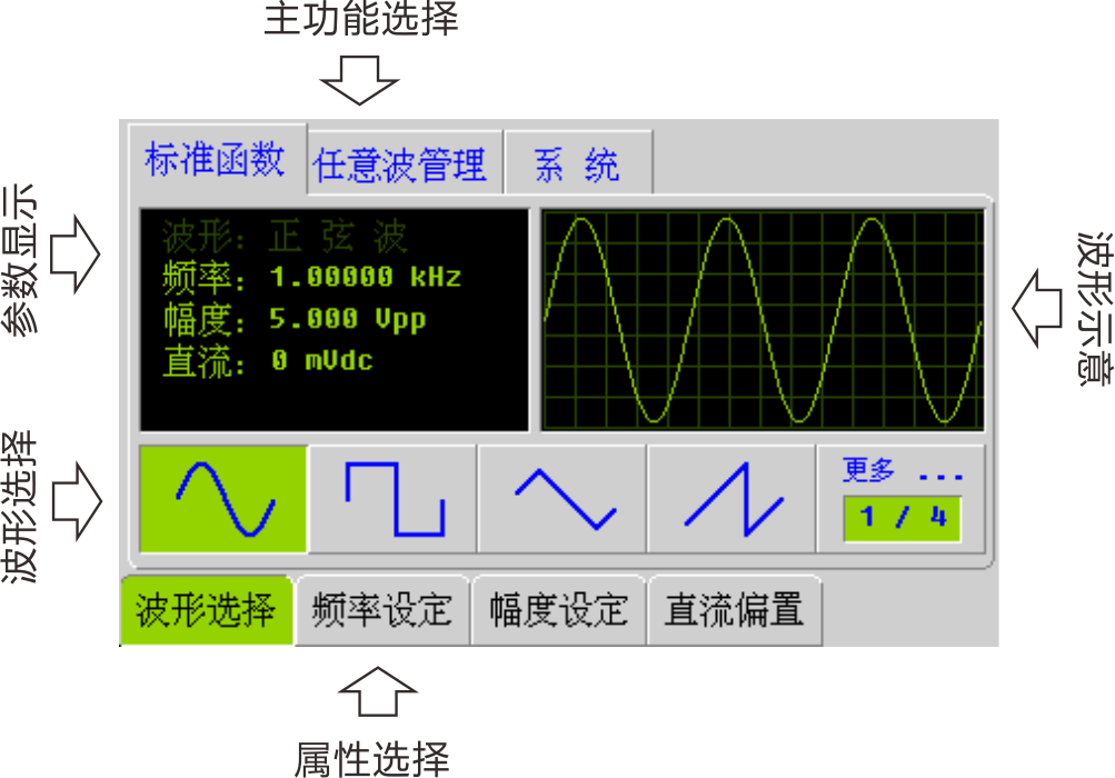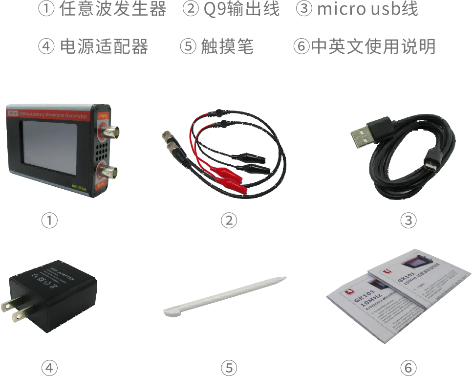 通过附件触摸笔(或者手指指甲)触控界面,完成波形选择、参数设定。设定后可通过附送Q9线缆(或示波器探头)连接示波器,观看波形。注:电阻屏需要有压感才能有效。