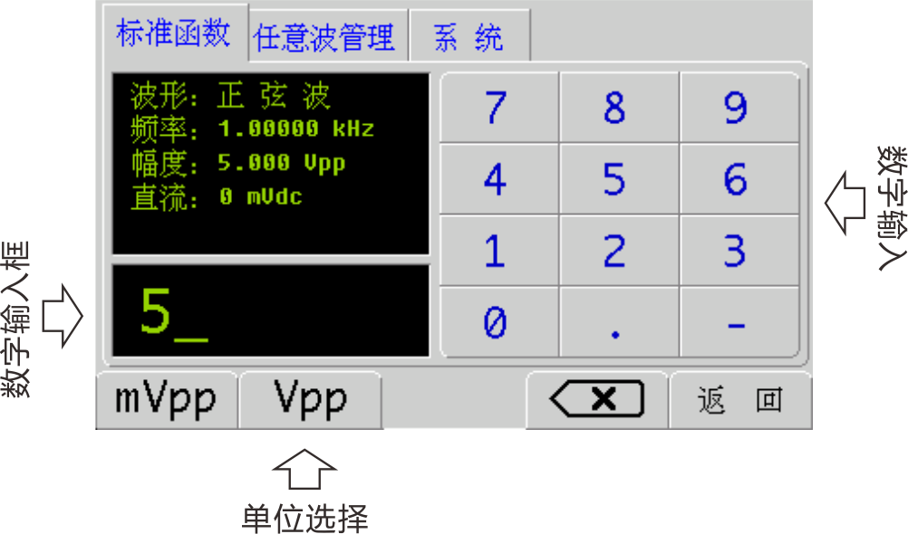②:Output:波形输出端口。本端口为仪器的主输出端口,可以输出标准波形/任意波形。具有50欧姆输出阻抗。使用时请不要将高压输入到此端口。